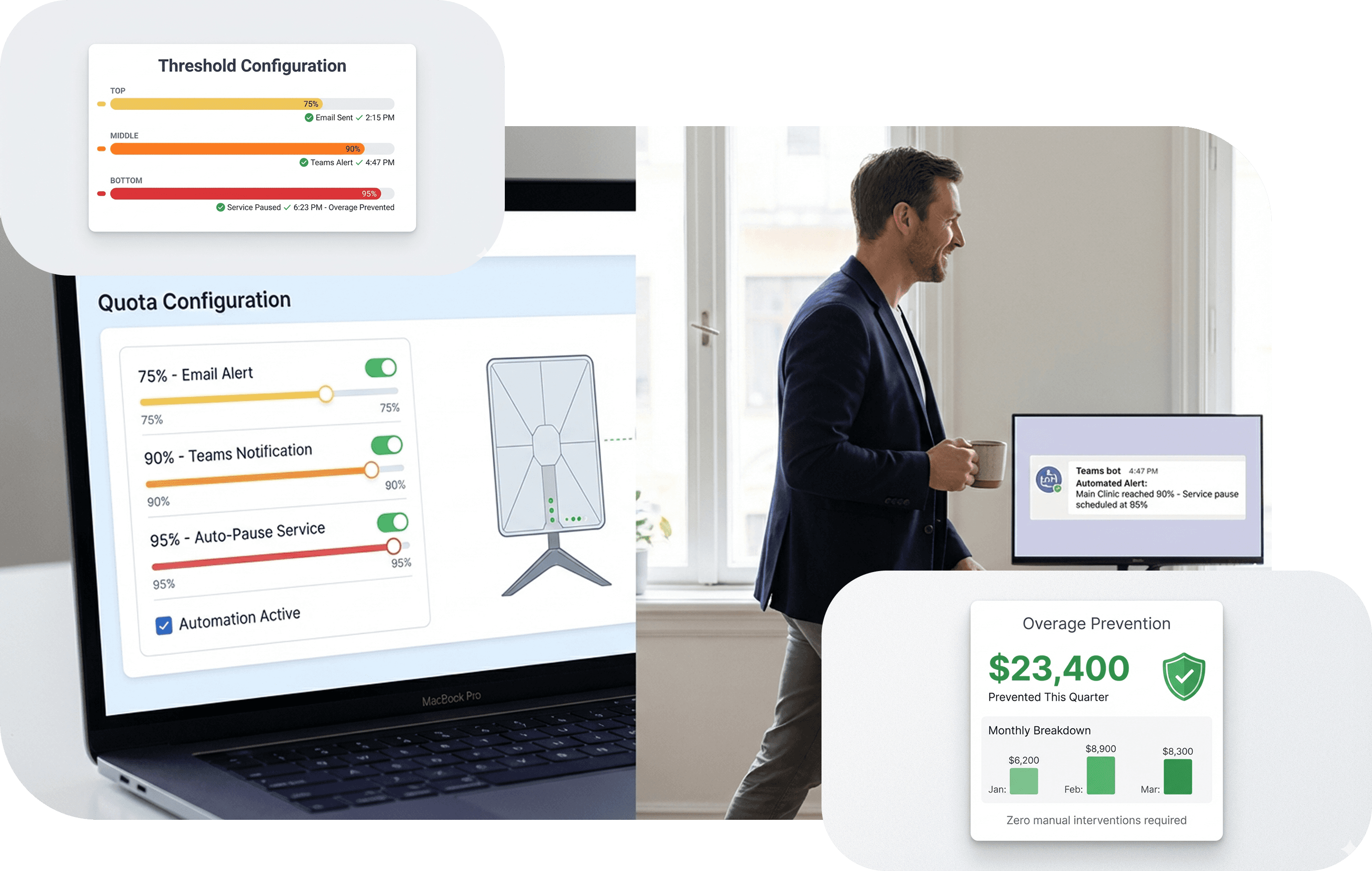 Configure percentage thresholds (75%/90%/95%). Automated email and Teams alerts. Service lines pause before overages. Mobile Priority opts out during high usage. Resumes automatically when quota renews. Zero manual intervention.