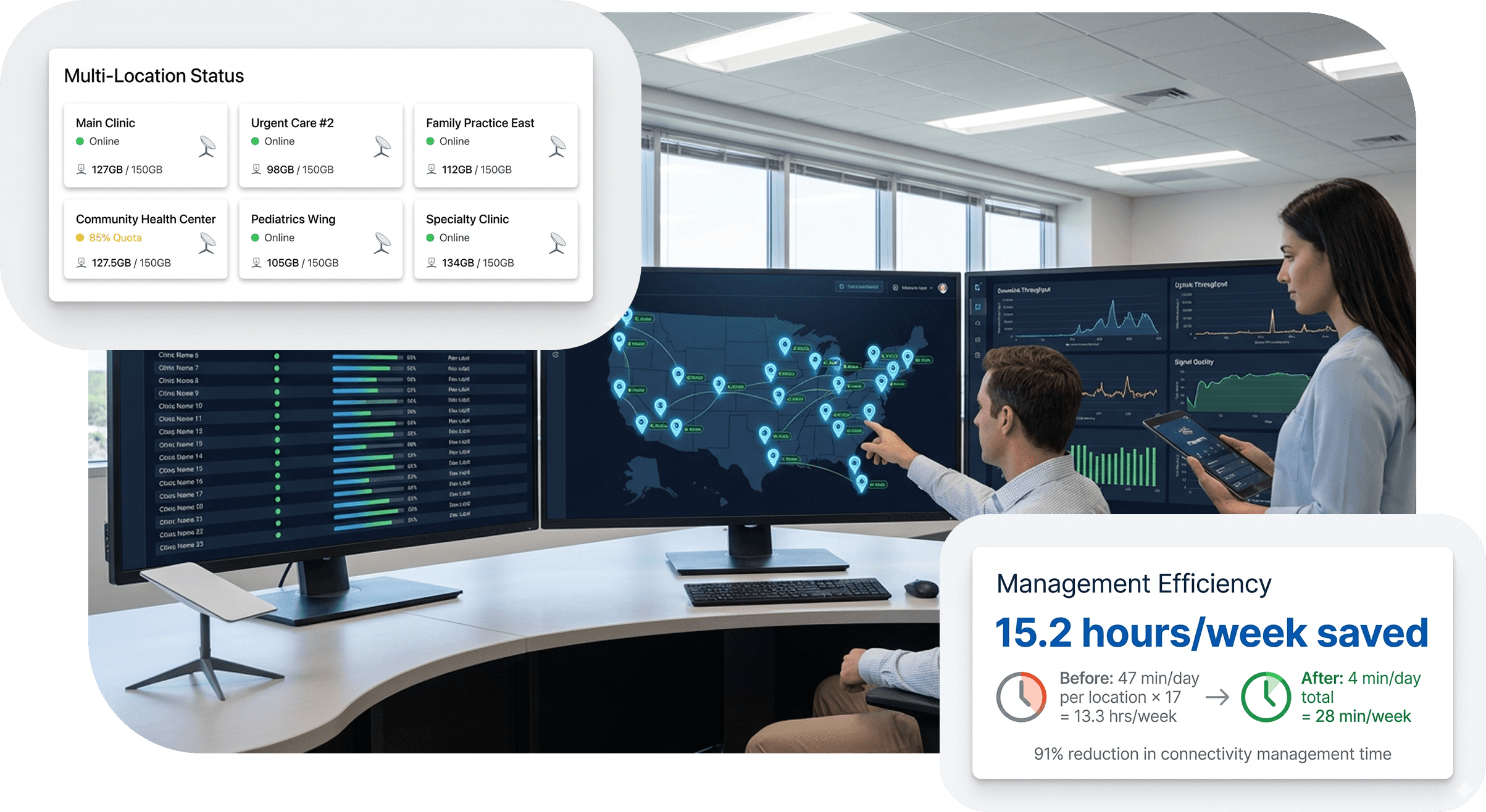 IT directors managing 10+ clinics log into separate Starlink accounts. Check usage manually. Get surprised by overage charges. No central dashboard.