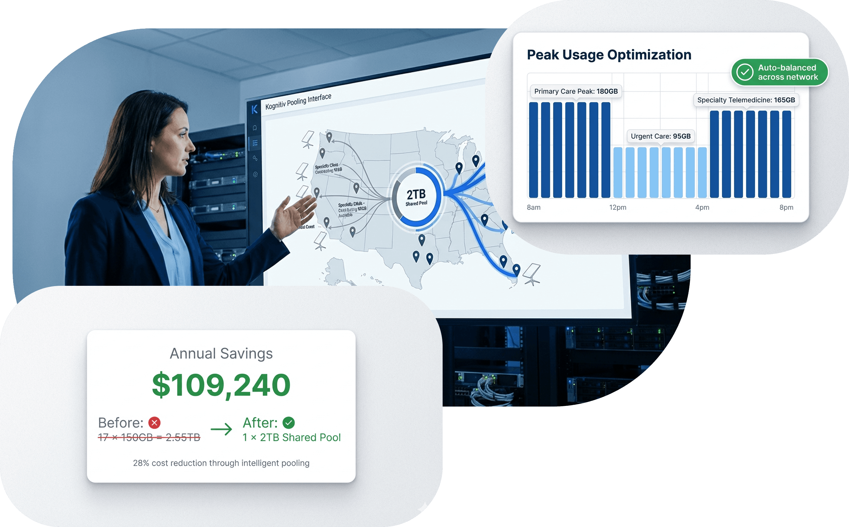 Your main clinic uses 80GB during morning rush. Your specialty clinic sits at 20GB until afternoon telemedicine starts. You're paying for both to have full capacity—wasting money.